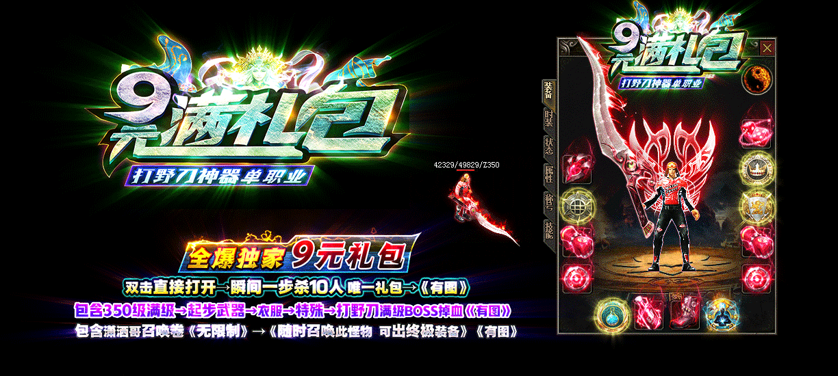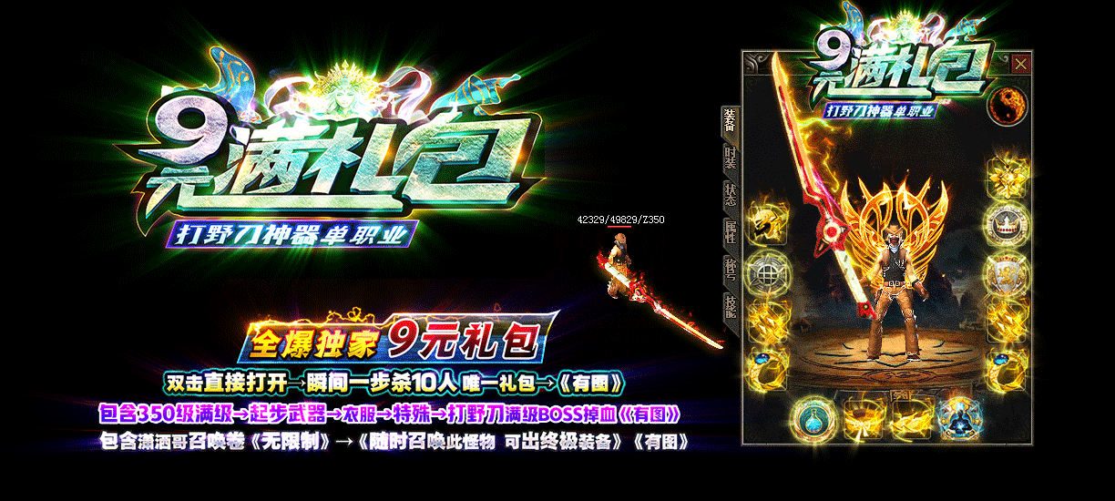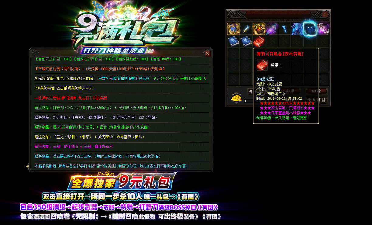 • 9元礼包→包含潇洒哥召唤卷《无限制》→《随时召唤此怪物,可出终极装备